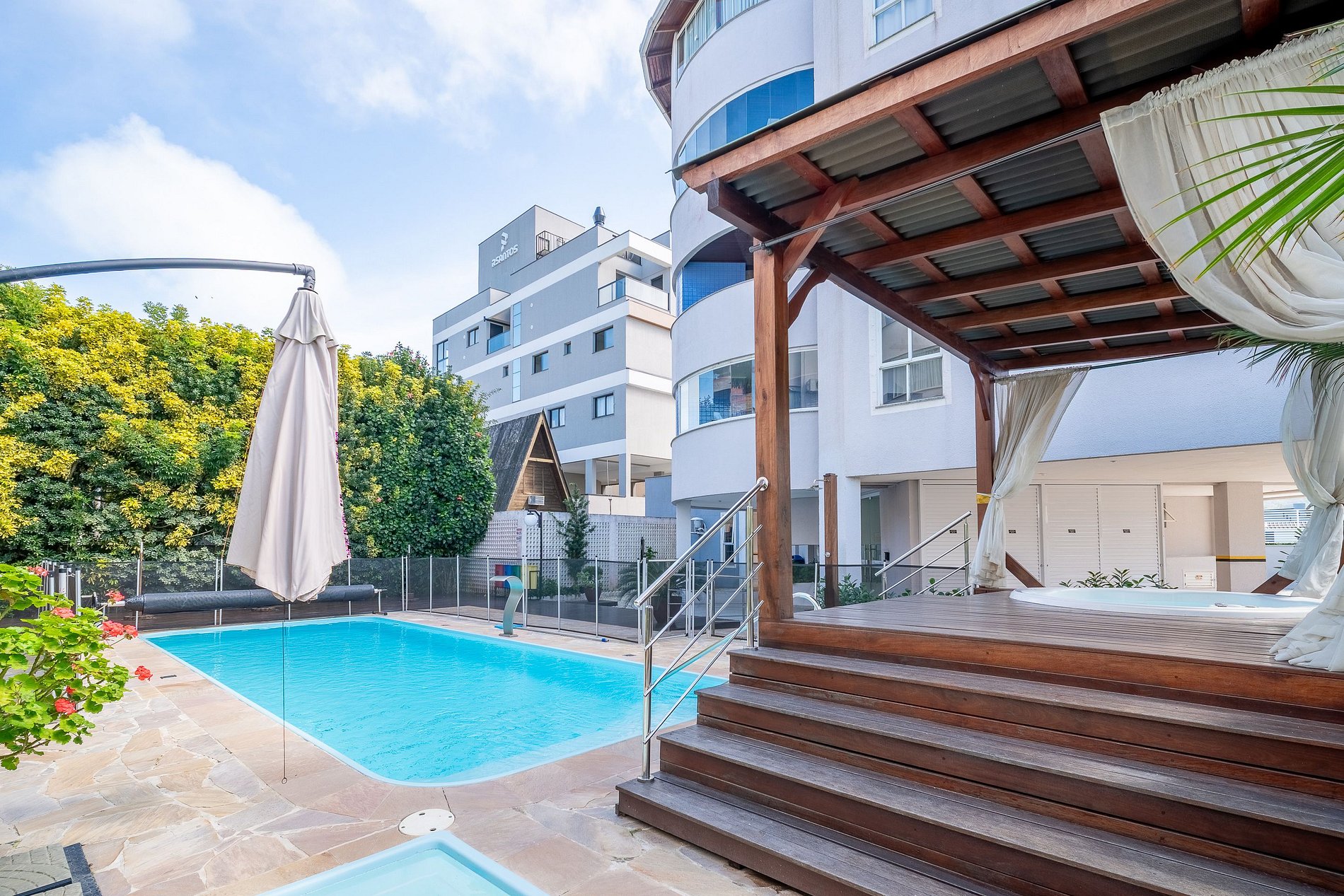 Condomínio com piscina ao ar livre e jacuzzi compartilhada.