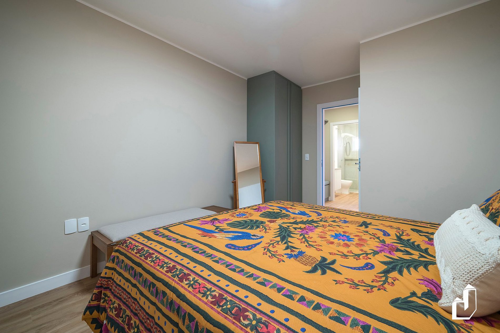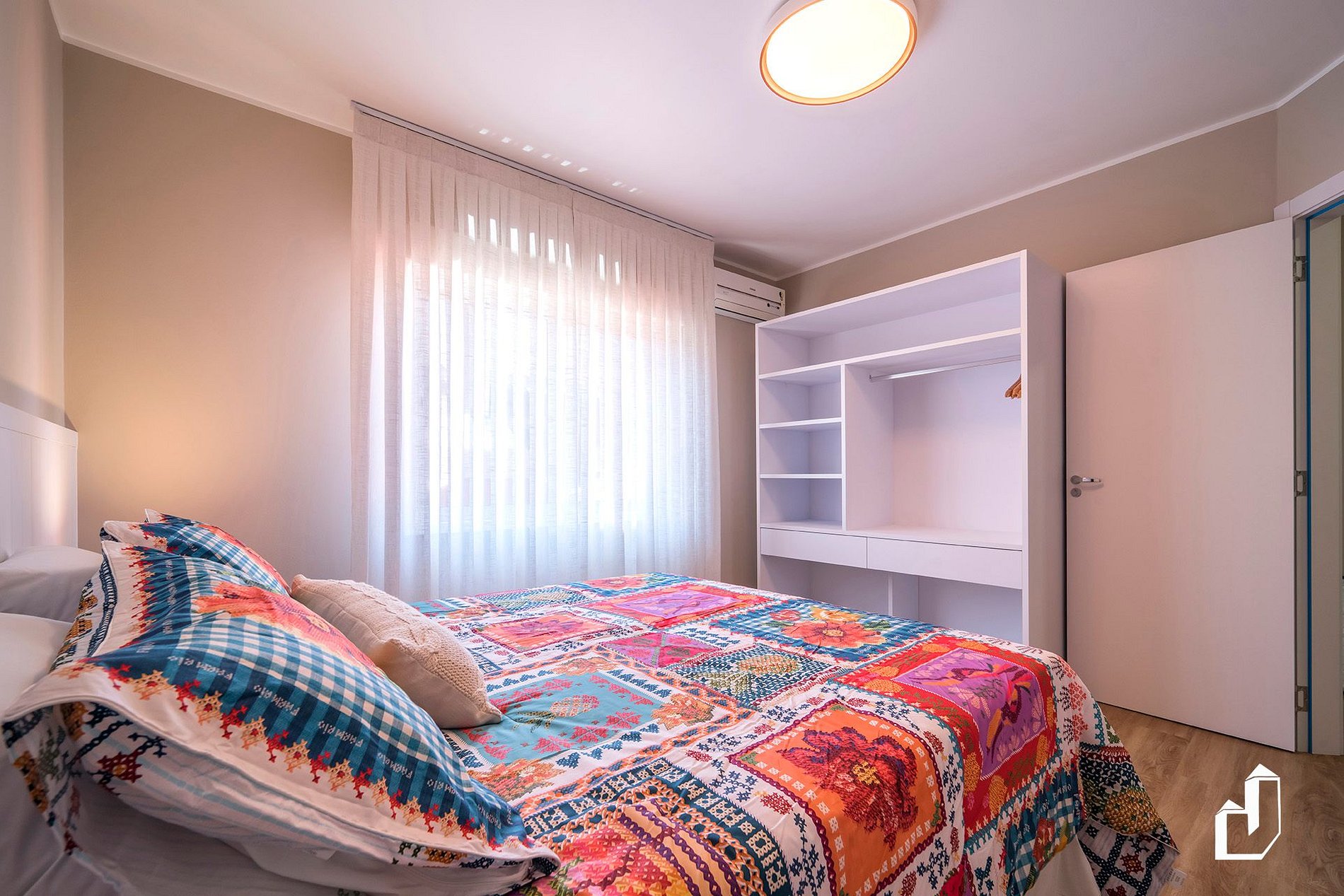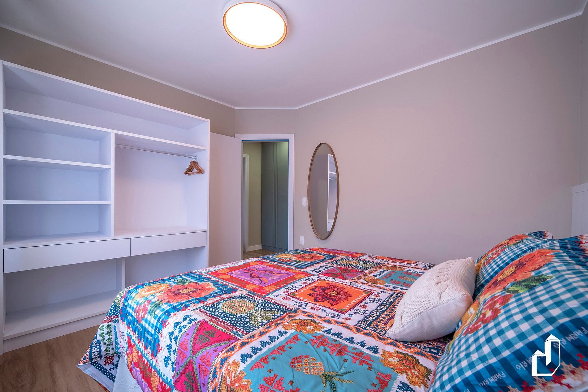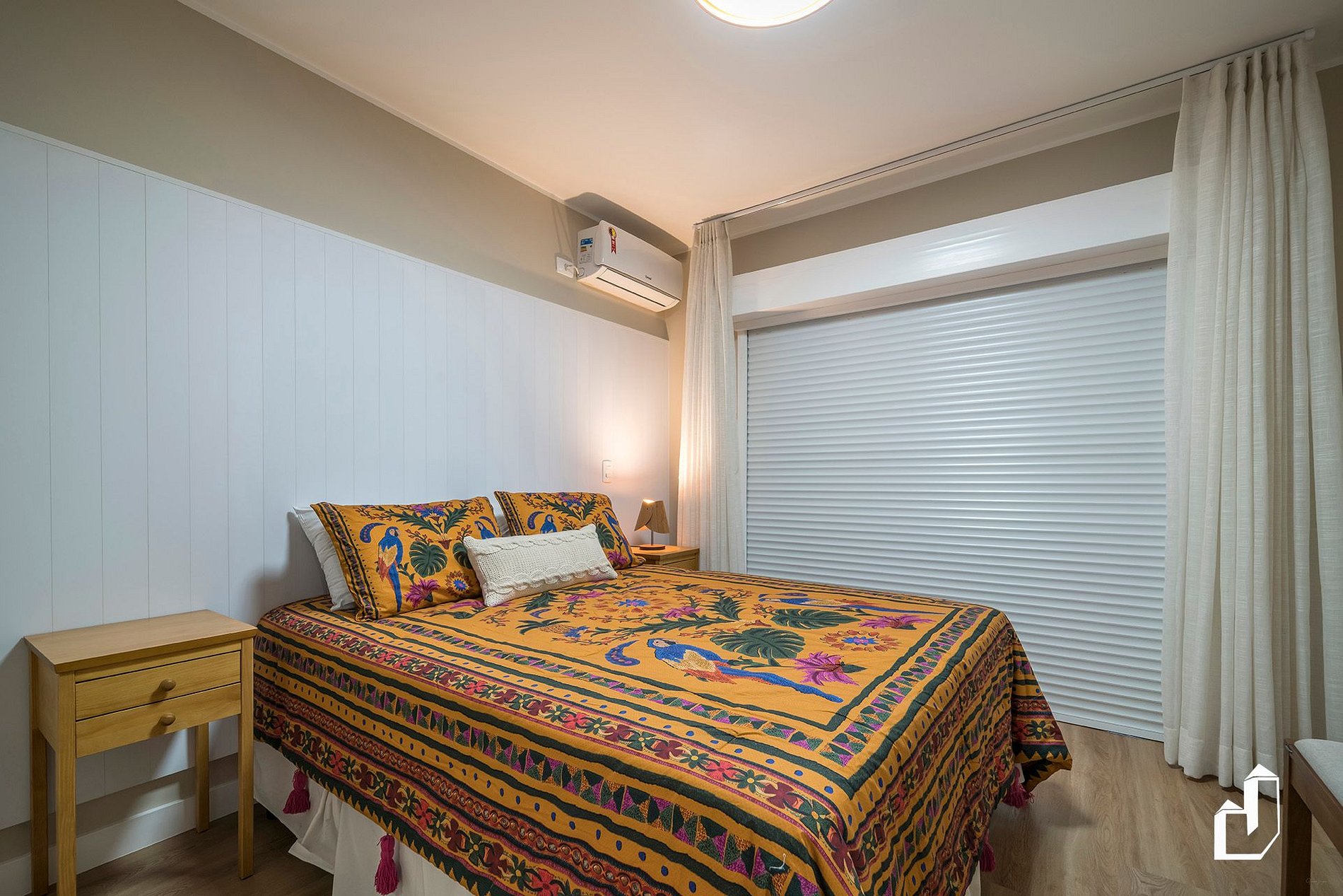 01 dormitório com cama de casal que também possui 01 cama auxiliar de solteiro com ar-condicionado.