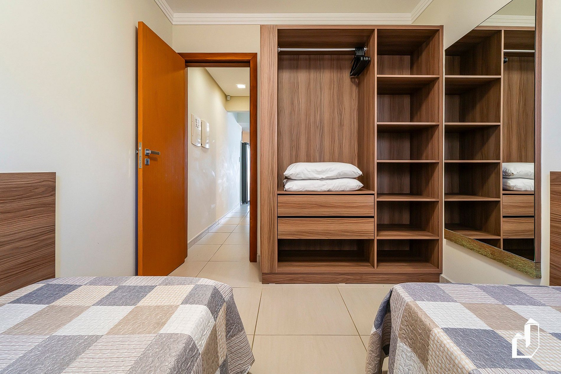 01 dormitório com duas camas de solteiro + 01 cama de solteiro auxiliar com ar-condicionado quente/frio;
