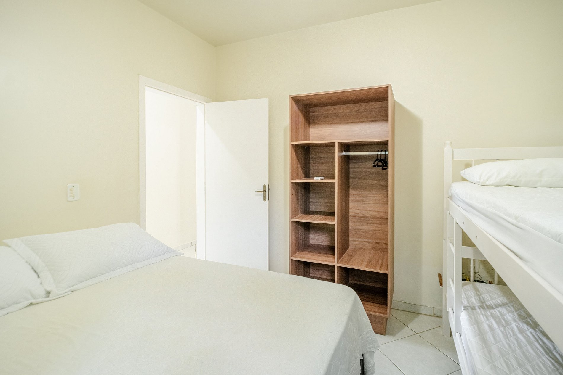 01 dormitório com uma cama de casal e um beliche com ar-condicionado.