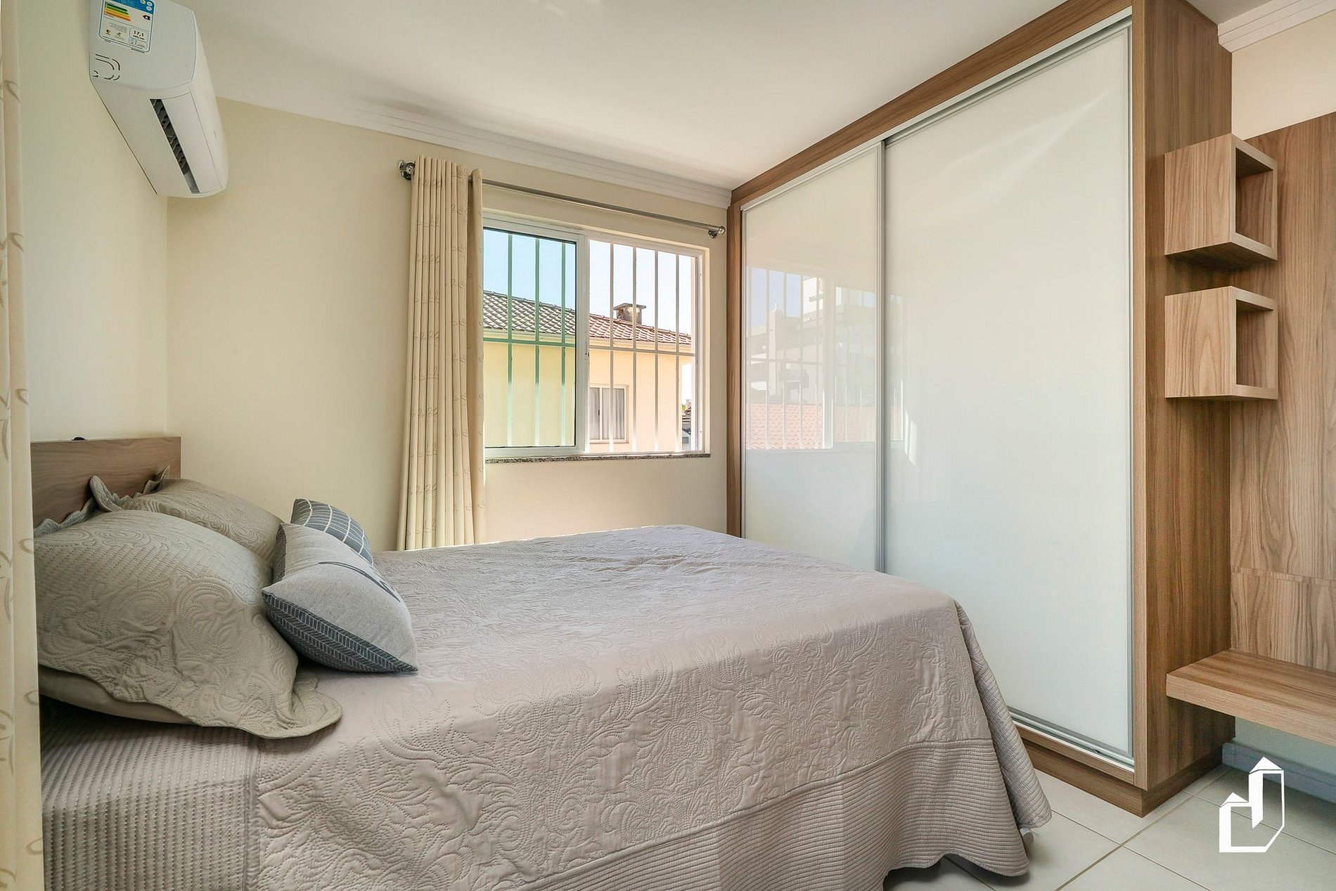 01 dormitório com 01 cama de casal, 01 cama de solteiro + 01 cama de solteiro retrátil com ar-condicionado quente/frio.