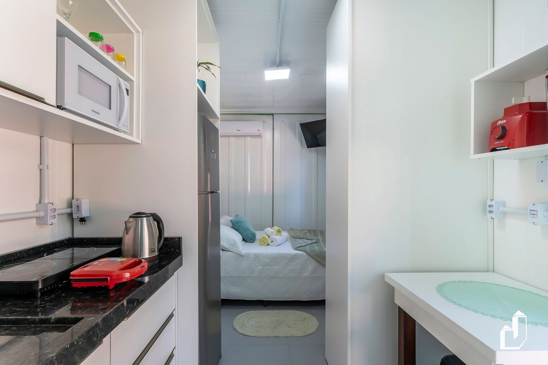 Cada estúdio conta com: cama de casal, ar-condicionado, cozinha equipada, banheiro privativo, toalhas e roupas de cama.