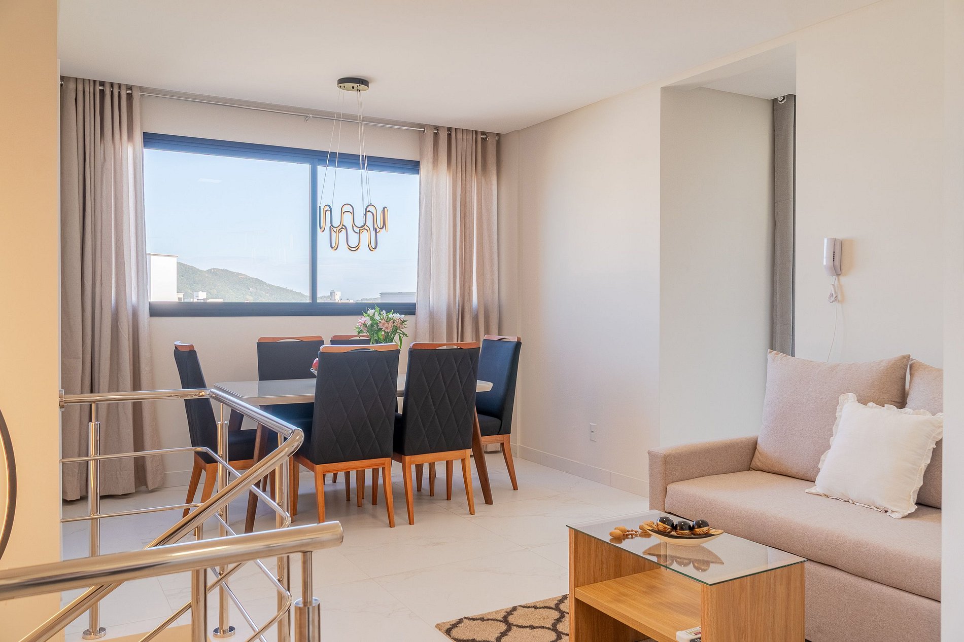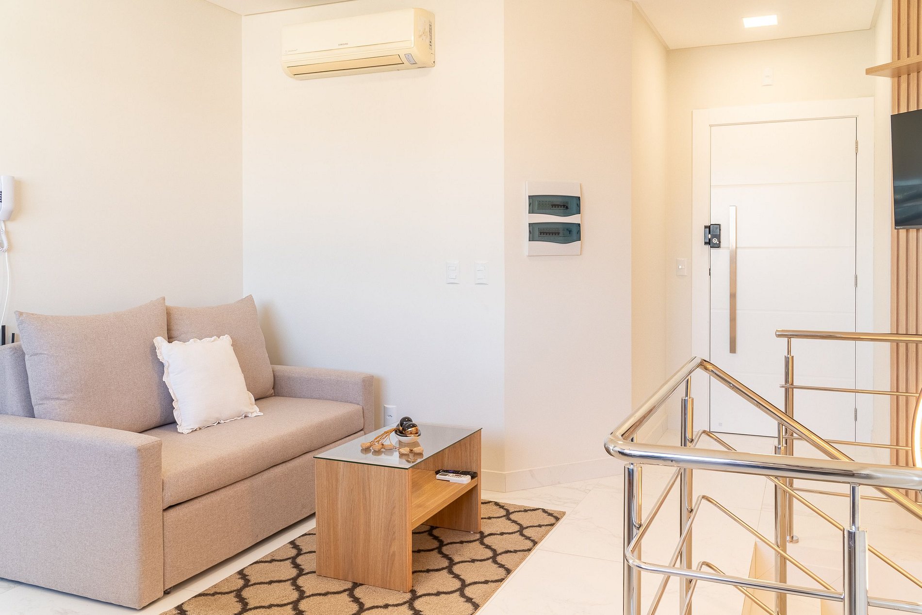 A área social é no andar superior, com sala (possui um sofá cama para acomodar até 02 crianças), banheiro social, cozinha equipada e ampla sacada com churrasqueira e vista para o mar.