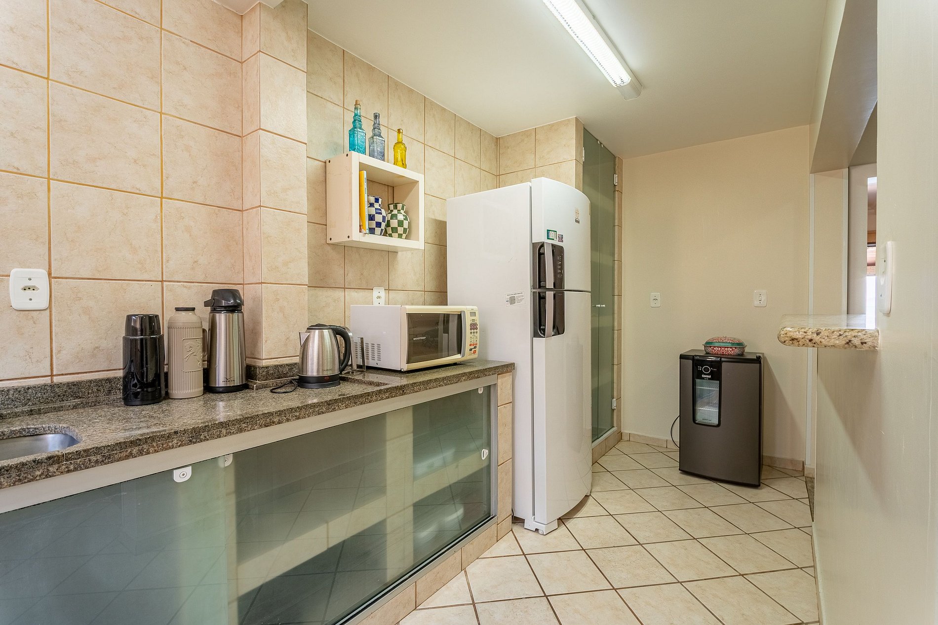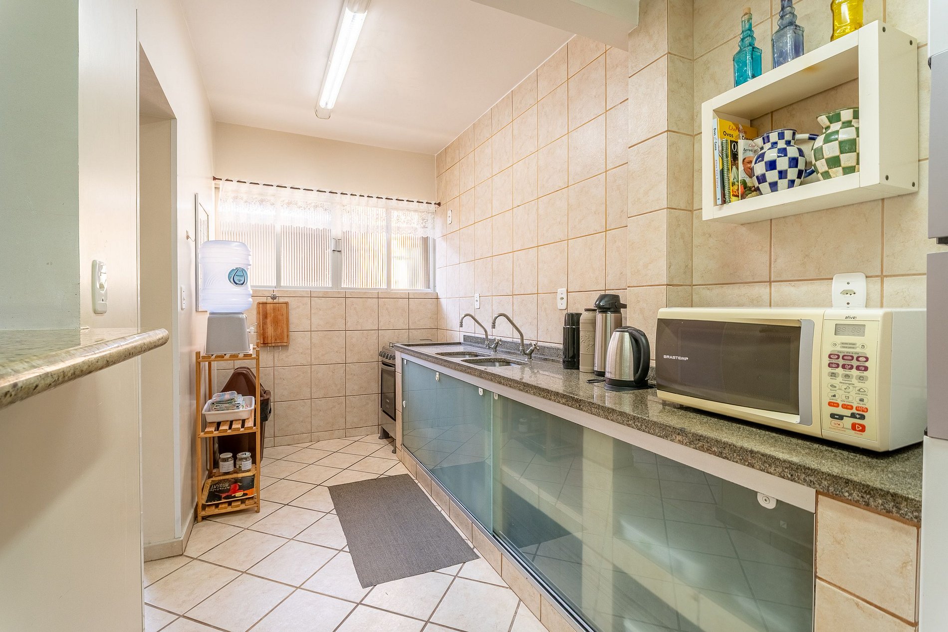 Cozinha equipada com geladeira duplex, cervejeira, fogão, micro-ondas, liquidificador, chaleira elétrica, sanduicheira e utensílios básicos;
