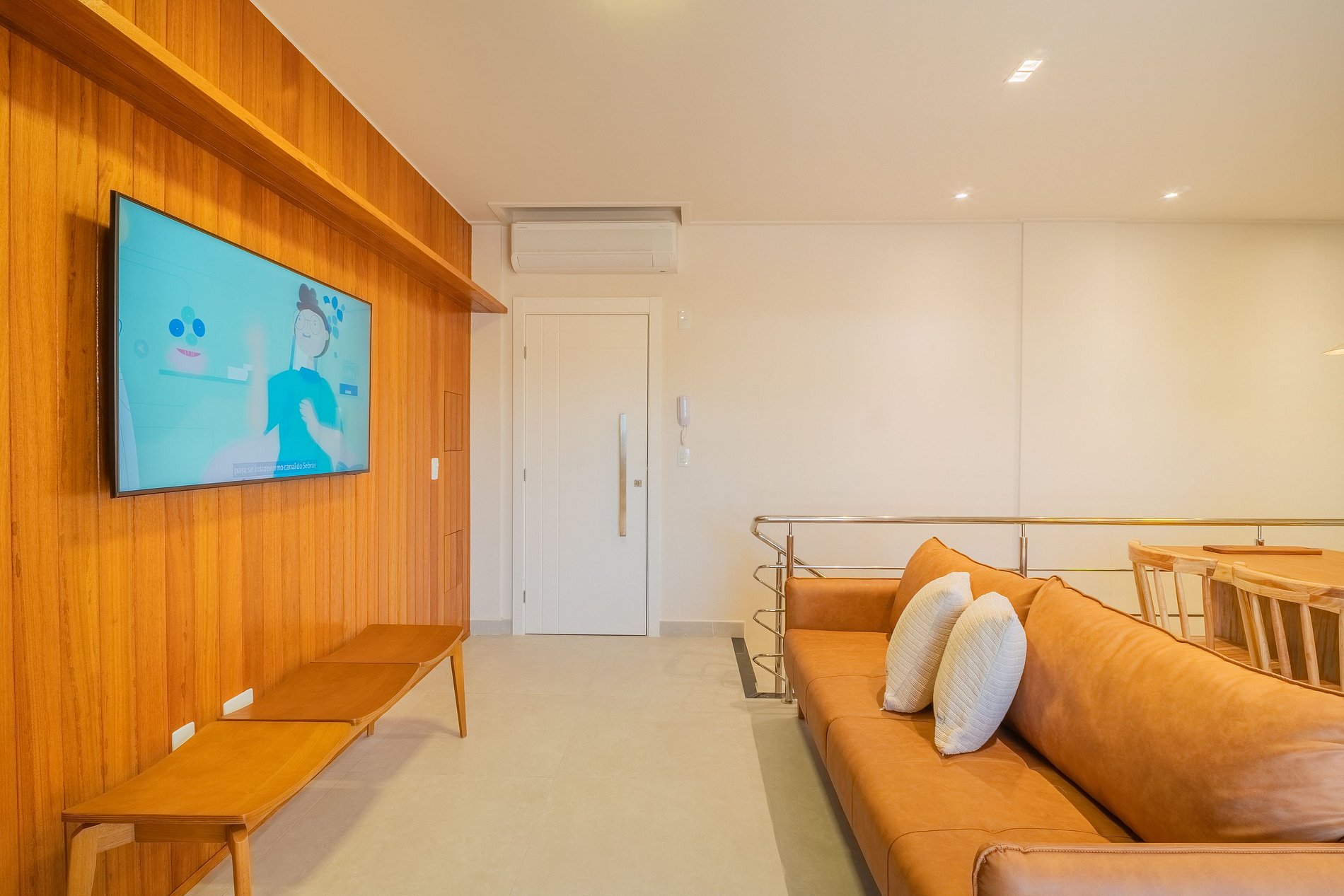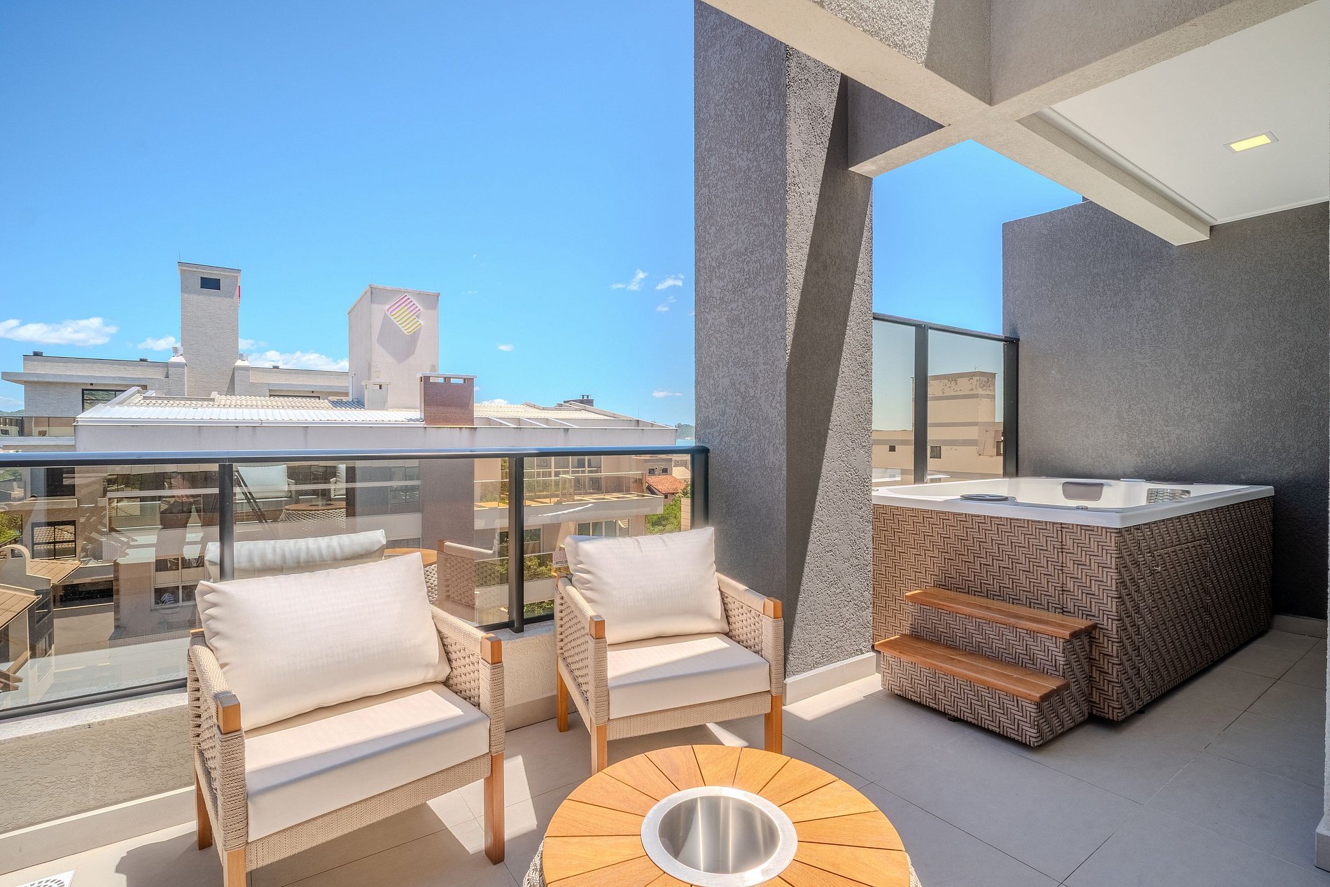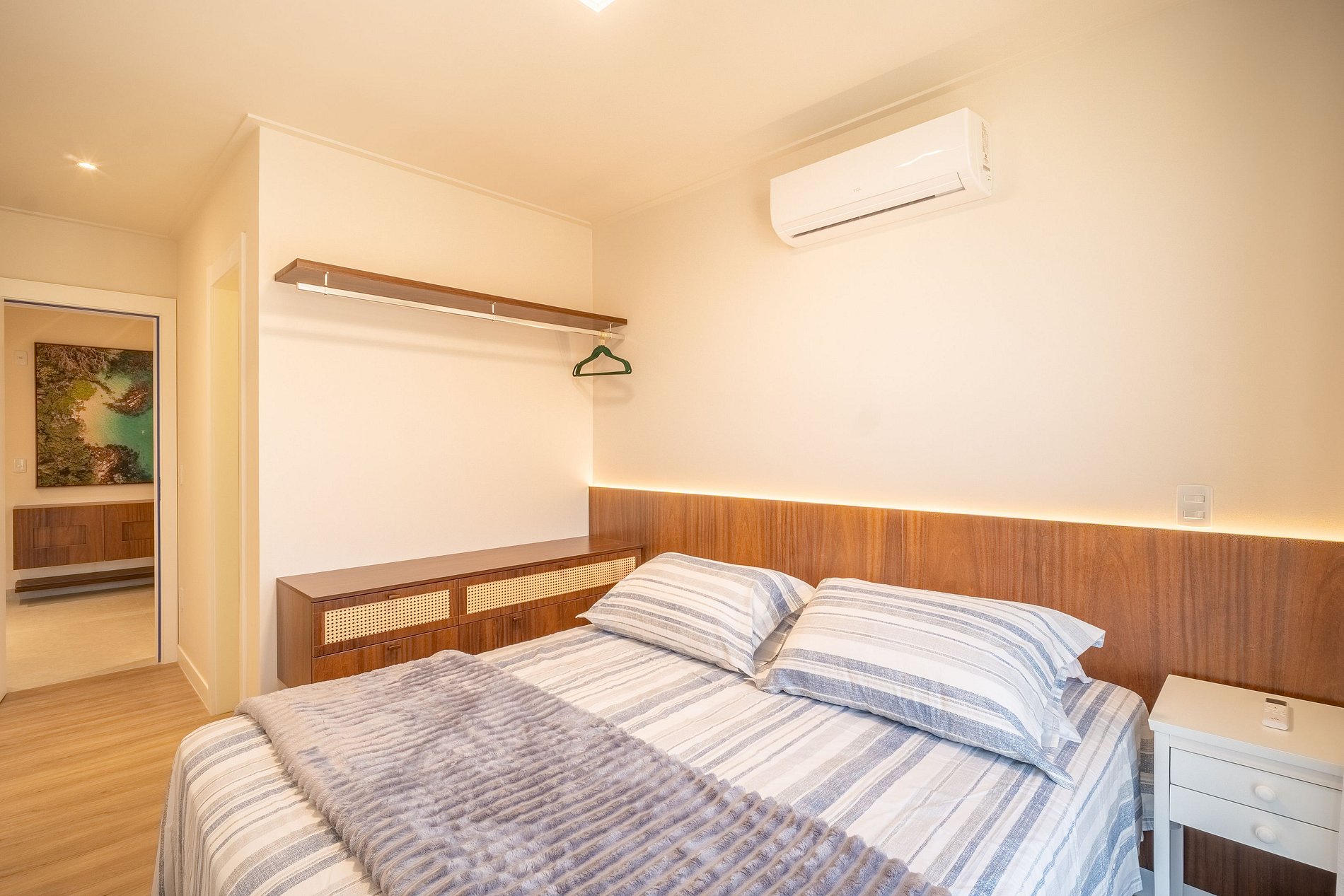 A sala e a cozinha são climatizadas e totalmente equipadas, oferecendo um ambiente funcional e aconchegante para os momentos de convivência. Na área externa, o apartamento dispõe de um espaço de churrasqueira bem ambientado e lavanderia completa.