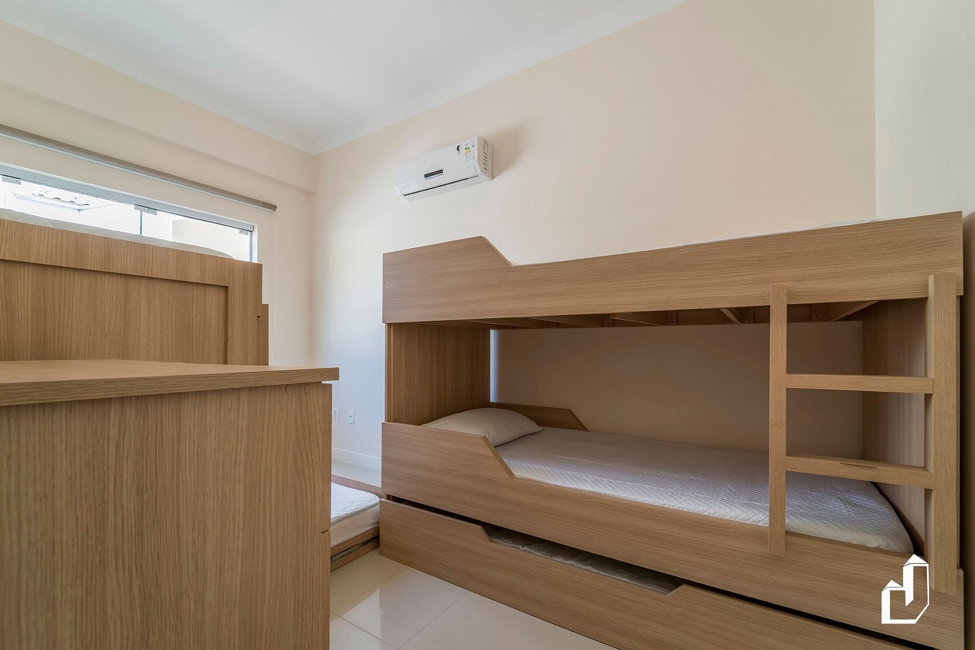 01 dormitório com um beliche e um treliche com ar-condicionado.