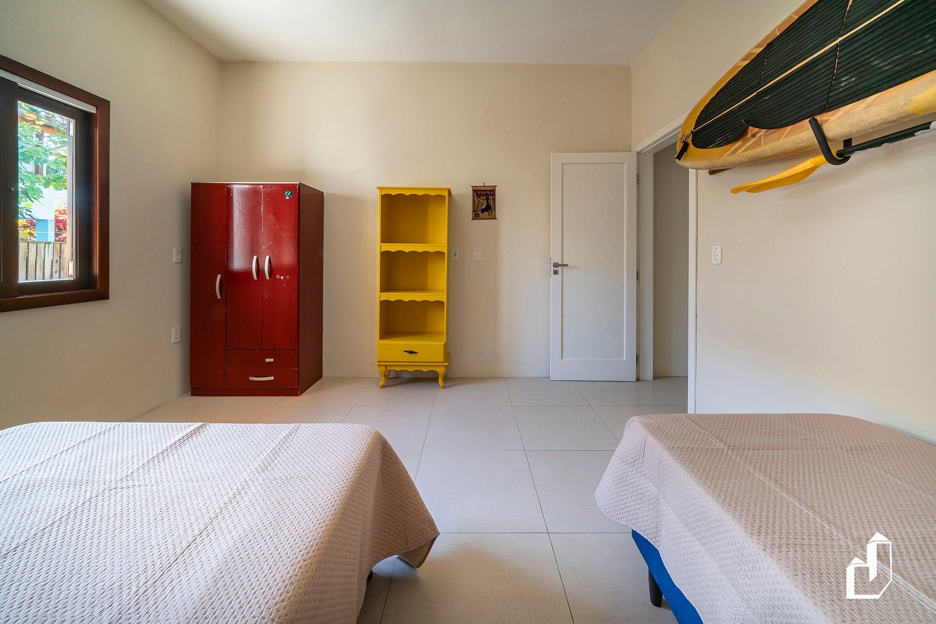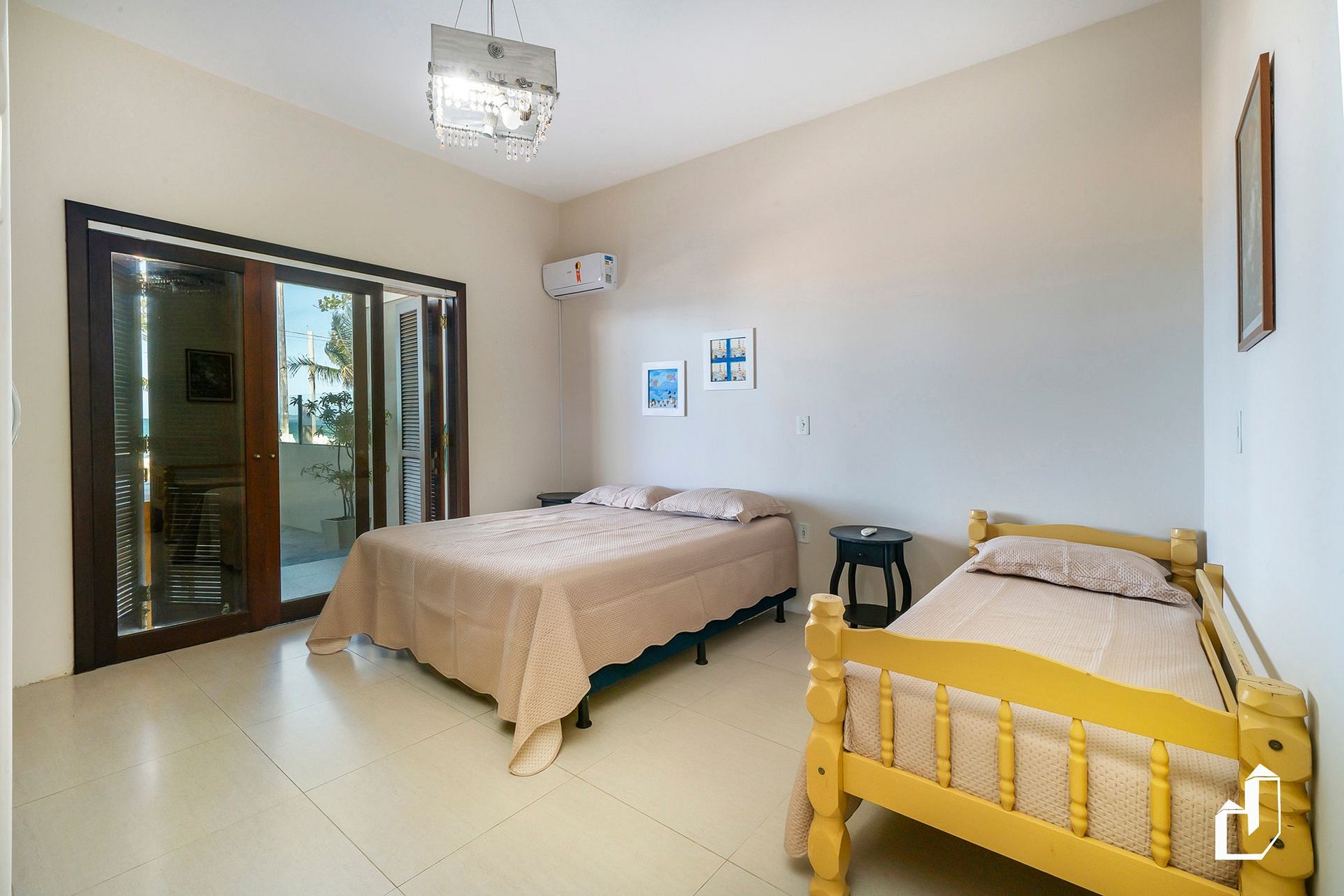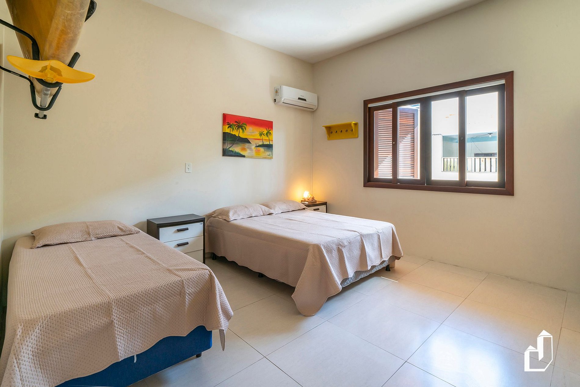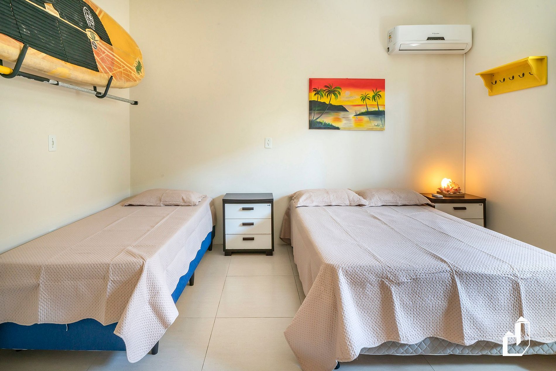 01 suíte térrea com uma cama queen e uma de solteiro e ar-condicionado quente/frio;