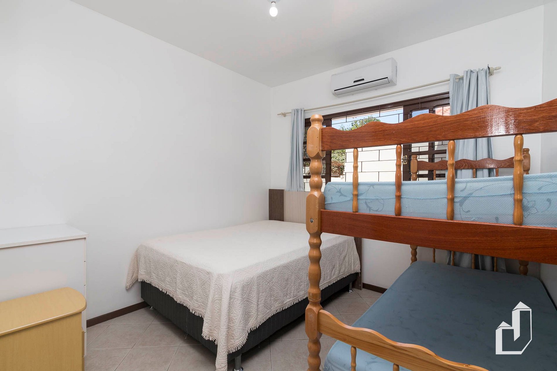 01 dormitório com uma cama queen e um beliche com ar-condicionado;