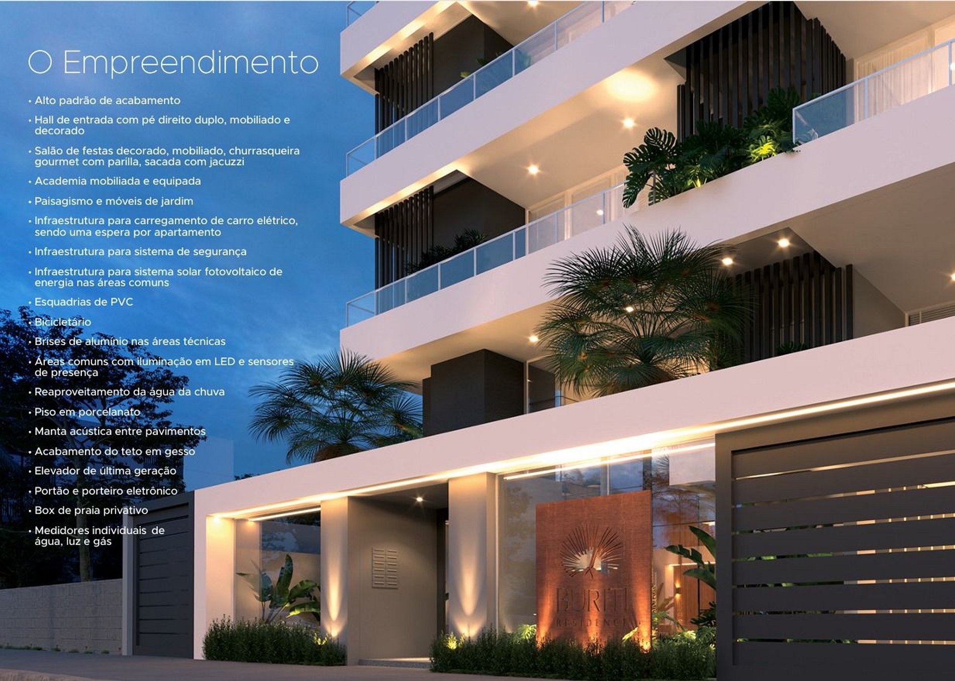 O Buriti Residence é um empreendimento de alto padrão, sofisticado e exclusivo, idealizado para famílias que sonham em morar ou veranear com conforto em um dos locais mais bonitos, preservados e valorizados de Santa Catarina.