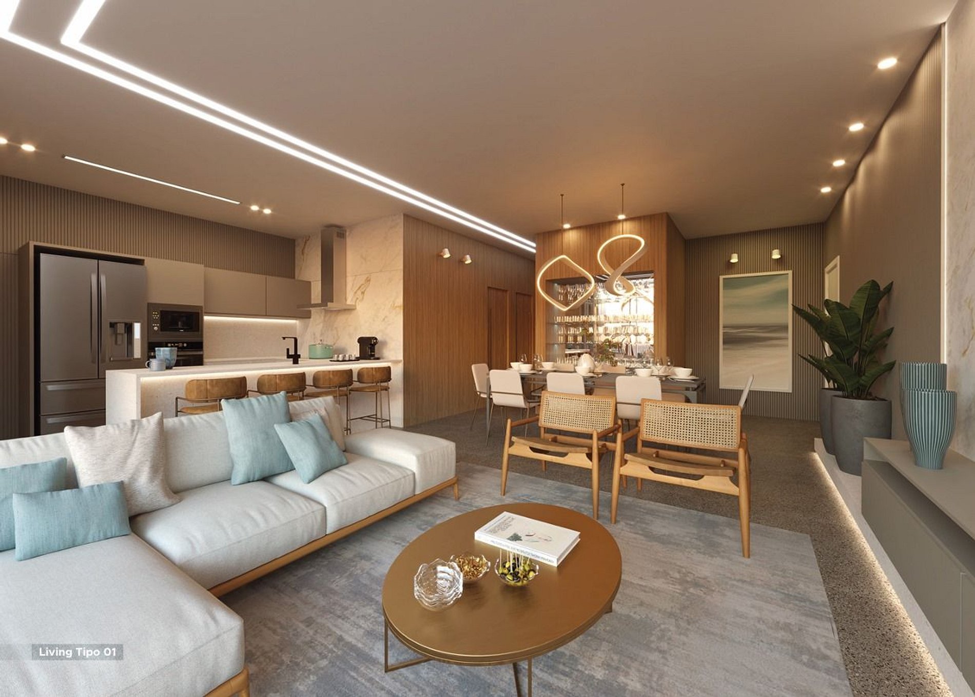 • Acabamentos de alto padrão: Piso porcelanato retificado e acetinado, rebaixamento em gesso, esquadrias do living no sistema piso-teto com 2,90m de altura, nicho nos boxes de chuveiro e monocomando.