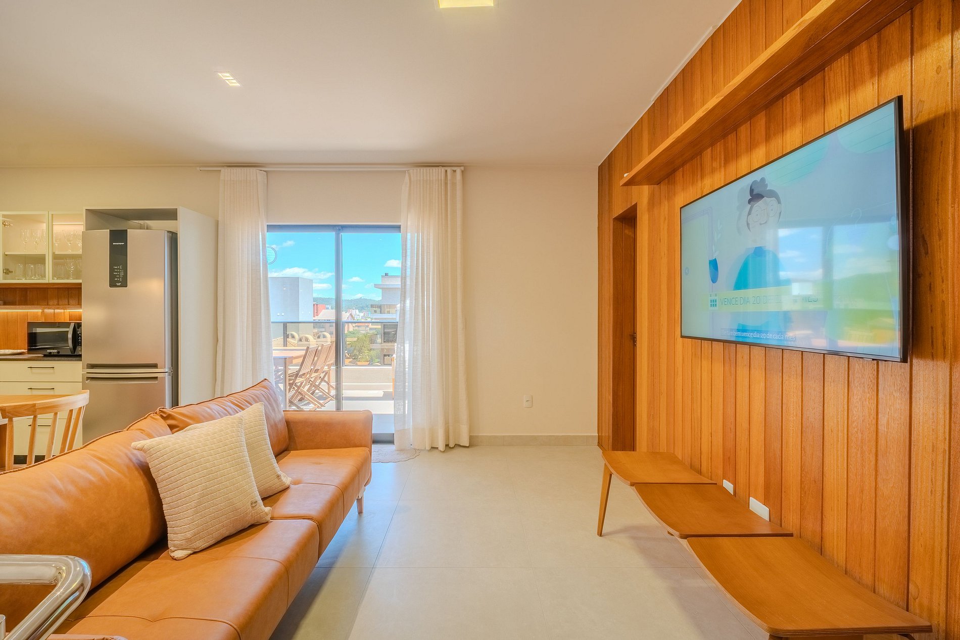 A sala e a cozinha são climatizadas e totalmente equipadas, oferecendo um ambiente funcional e aconchegante para os momentos de convivência. Na área externa, o apartamento dispõe de um espaço de churrasqueira bem ambientado e lavanderia completa.