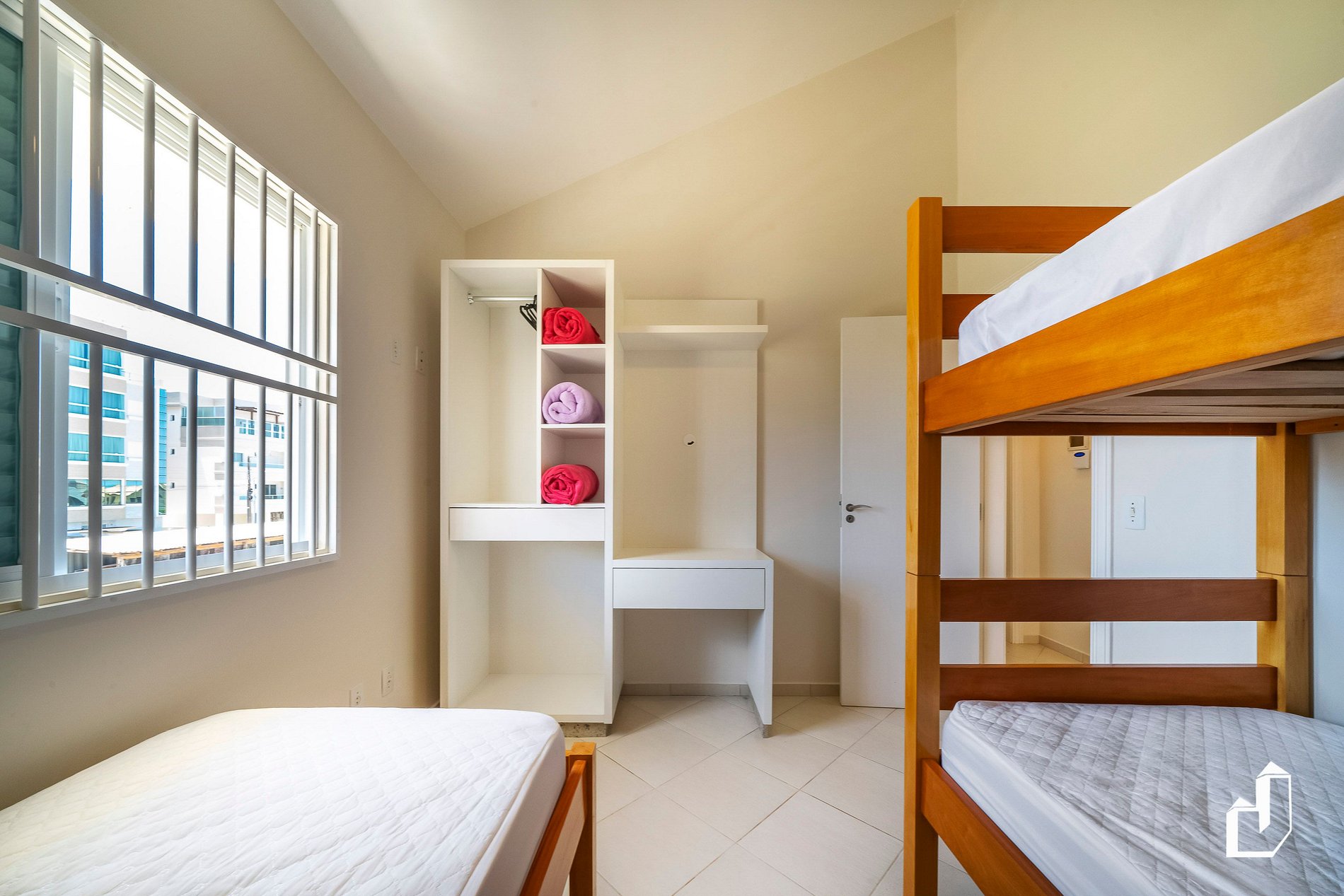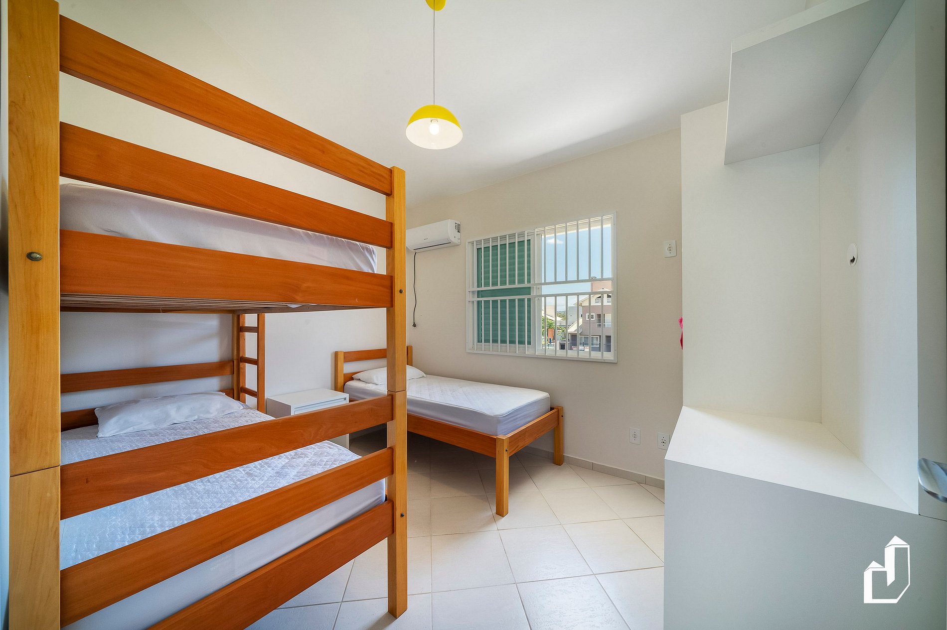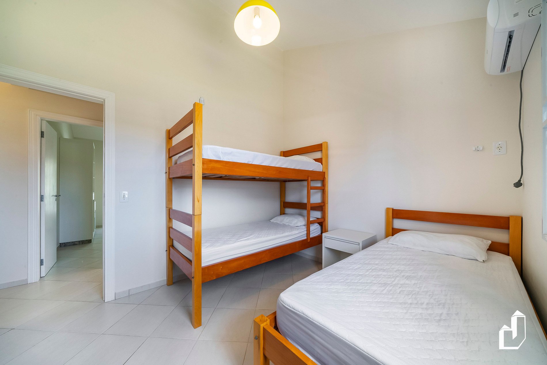 01 dormitório com um beliche e uma cama de solteiro com ar-condicionado;