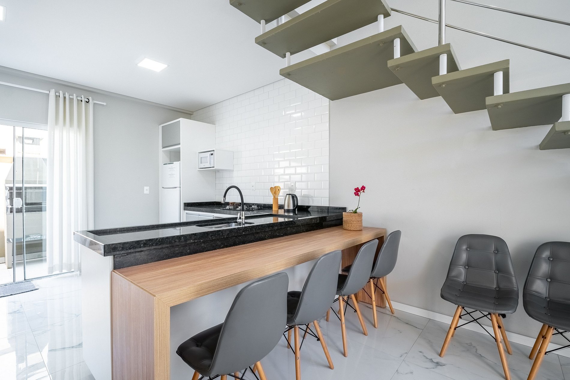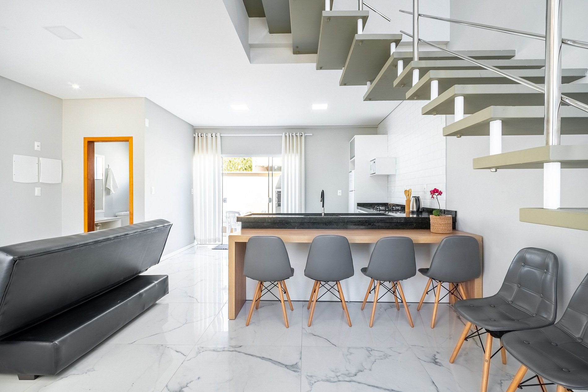 A sala é integrada, garantindo momentos de convivência, enquanto a cozinha está equipada com utensílios básicos para preparar refeições com comodidade. Possui churrasqueira, Wi-Fi e estacionamento.