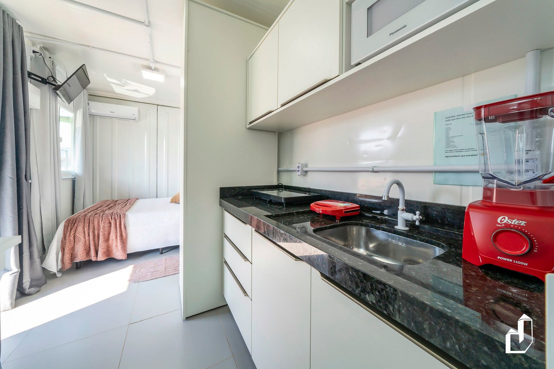Cada estúdio conta com: cama de casal, ar-condicionado, cozinha equipada, banheiro privativo, toalhas e roupas de cama.