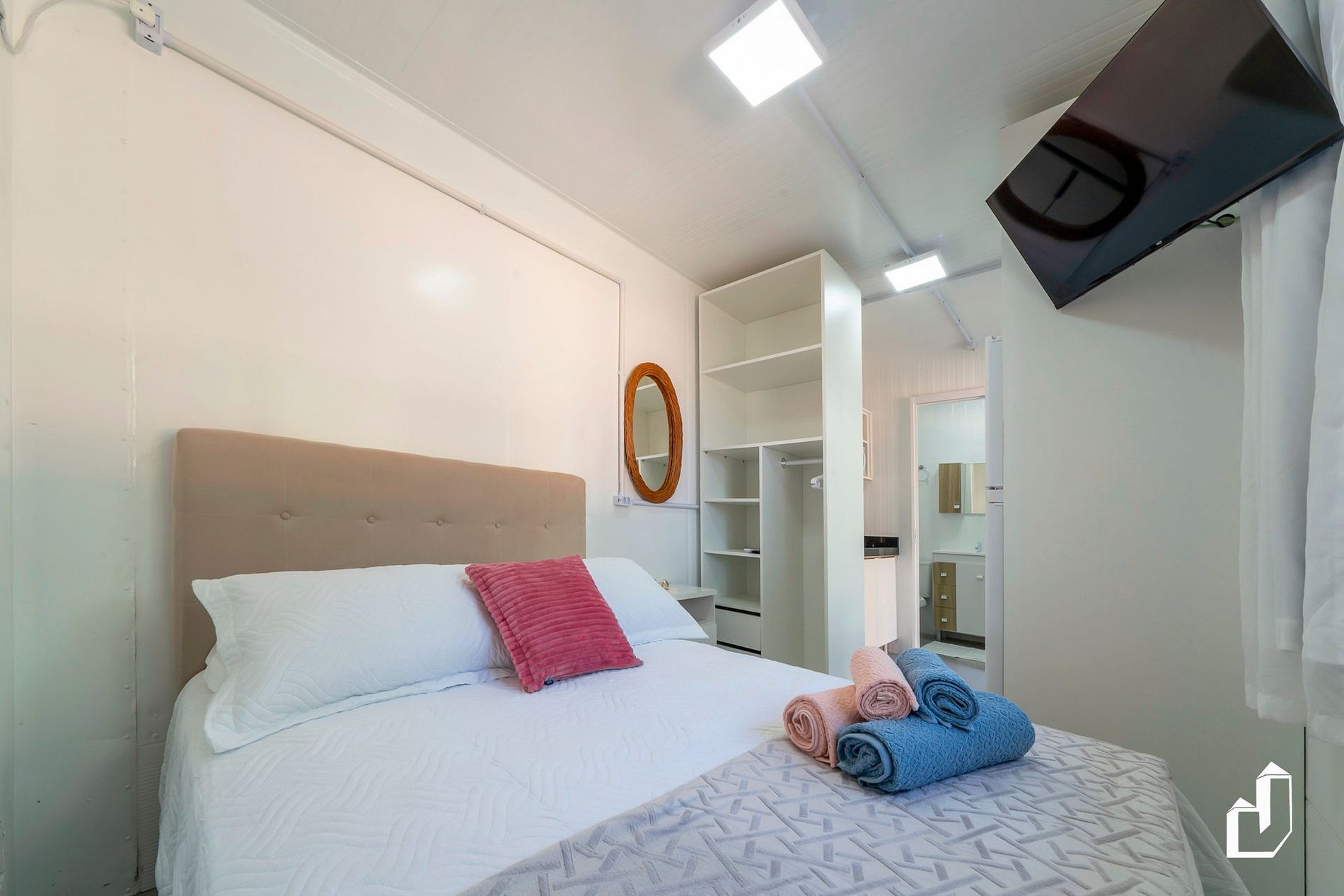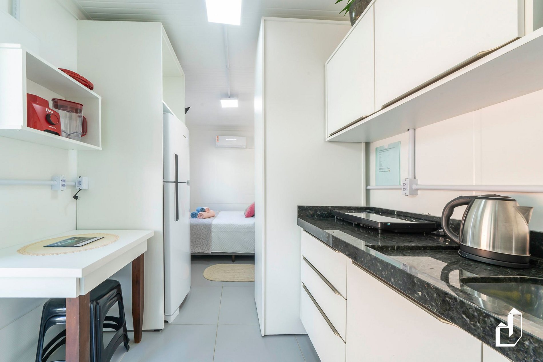 Cada estúdio conta com: cama de casal, ar-condicionado, cozinha equipada, banheiro privativo, toalhas e roupas de cama.