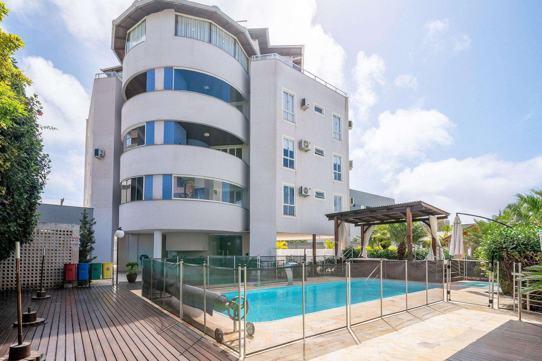 Condomínio com piscina ao ar livre e jacuzzi compartilhada.
